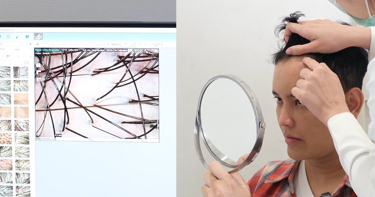 1. ประเมินสภาพเส้นผม/หนังศีรษะ โดยแพทย์ปลูกผมเฉพาะทาง (Trichoscopy/Dermoscopy)